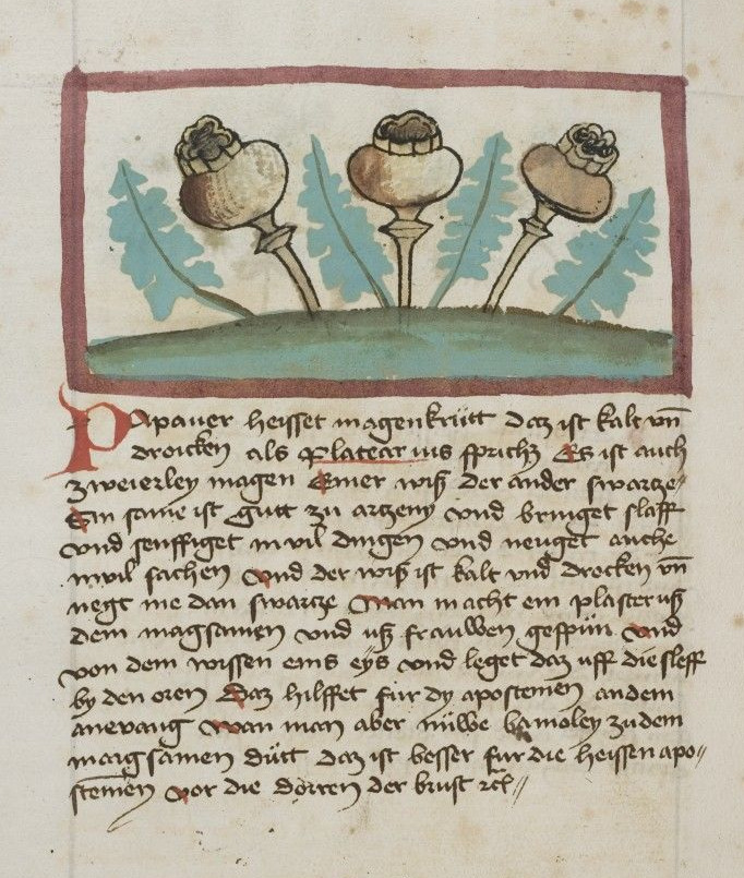 Abbildunng 4: Darstellung des Schlafmohns in Johannes Hartliebs Kräuterbuch, 1460 (Universitätsbibliothek Heidelberg, Cod. Pal. Germ. 311, Bl. 300v, Public Domain)